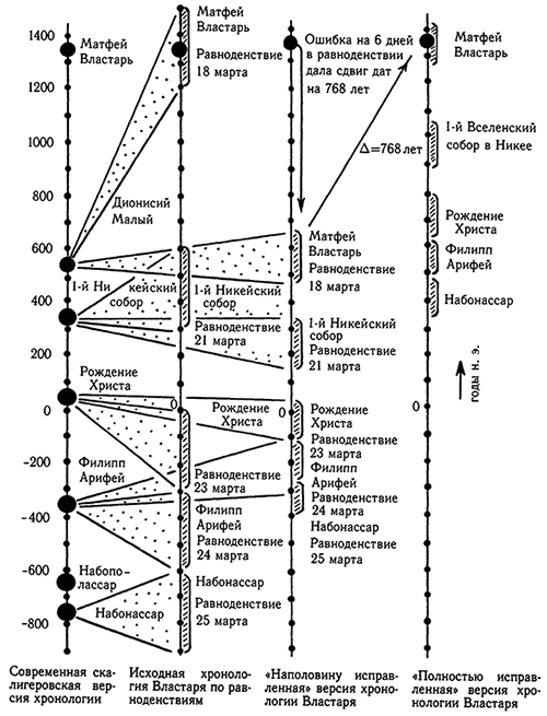 Отметим, что «полностью исправленная» хронология равноденствий Матфея Властаря помещает самое древнее событие – правление Набонассара (Навунасара) в IV–V века н. э. (!), а для даты Первого Вселенского собора отводит промежуток, согласующийся с полученной нами выше независимой датировкой: конец IX века н. э. Но даже и эту «полностью исправленную» хронологию Властаря нельзя считать близкой к истине без дополнительного тщательного исследования. Тем более нельзя этого говорить о его «неисправленной» и «полуисправленной» версии, положенных в основу дожившей до наших дней хронологической версии-традиции Скалигера – Петавиуса.
