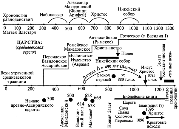 Впрочем, эта средневековая хронология тоже не соответствует действительности, будучи все еще излишне растянутой во времени. Однако здесь мы изложим эту промежуточную версию, поскольку она тоже представляет научный интерес. Она сильно отличается от скалигеровской версии, будучи намного короче ее.