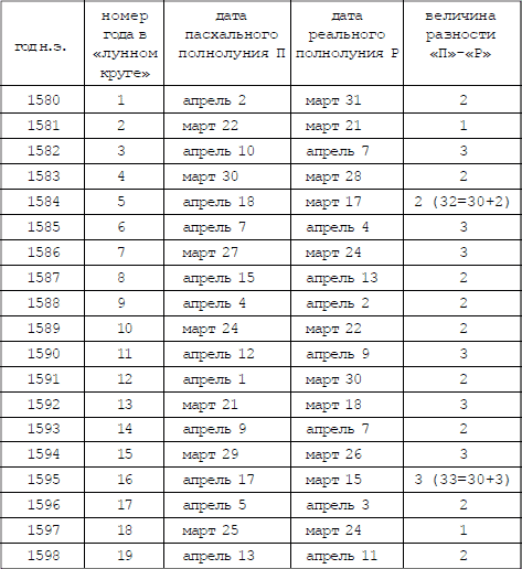 3) Само указание «величины отставания» пасхи от первого весеннего полнолуния (а тем более от весеннего равноденствия) не имеет смысла, поскольку промежуток времени между этими двумя событиями не постоянный (разный в разные годы). На самом деле тут имеется в виду отставание календарных пасхальных полнолуний (являющихся точками отсчета пасхи) от истинных астрономических полнолуний в XVI веке. Однако при этом известно следующее:4) Отставание пасхальных полнолуний от истинных составляло в XVI веке не 3–4, а 1–3 дня. Это видно из приводимой ниже таблицы сравнения дат пасхальных и истинных весенних полнолуний в 19-летнем цикле («круг луне») на время григорианской реформы: