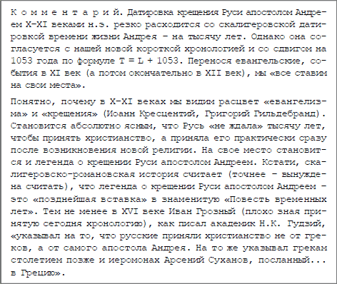 К начальному периоду Римской империи II (около I века н. э.) относится развернутый рассказ о великой церковной реформе, частично начатой Предтечей Христа – Иоанном Крестителем и завершенной самим Иисусом Христом. Об этом повествуют Евангелия. По-видимому, эти события происходили в эпоху Римской империи XII–XIII веков н. э. Наложение Римской империи II на Империю X–XIII веков является следствием хронологического сдвига на 1053 года (приблизительно). Этот сдвиг дат можно условно записать в виде формулы: Т = L + 1053, где L – традиционная дата события (в годах до н. э. или нашей эры), а T – новая дата этого события, предлагаемая А.Т. Фоменко в соответствии с ГХК. Так, например, если L = 0 (то есть начало н. э.), то новая дата X оказывается соответствующей 1053 году н. э. Другими словами, чисто формально из ГХК следует, что «началом н. э.» хронисты XIV–XV веков могли считать 1053 год н. э.