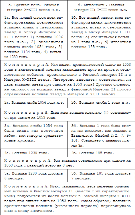 ВИФЛЕЕМСКАЯ ЗВЕЗДА I ВЕКА И ВСПЫШКА СВЕРХНОВОЙ ЗВЕЗДЫ В XII ВЕКЕОбратимся к некоторым интересным астрономическим данным, с неожиданной стороны подтверждающим наш результат, что Иисус Христос жил в XII веке н. э. См. книгу «Царь Славян». Приведем список дат (в скалигеровской хронологии), когда древними хрониками были зафиксированы вспышки так называемых новых и сверхновых звезд.