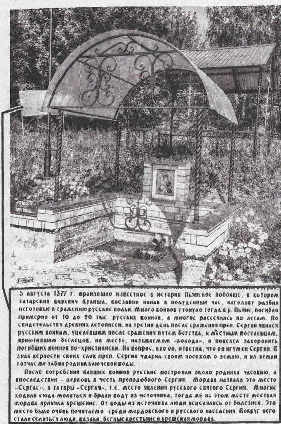 хватать воды. Тогда по молитве святого Сергия там забил целебный источник и образовался ручей, названный Сергиевой рекой. И действительно, под Сергачскими Колодами протекает небольшая речка СЕР1АЧКА, то есть — «Сергиева река». Ручей, вытекающий из источника в Колодах, течет вниз по крутому склону и примерно через 300 метров впадает в Сергачку. Через несколько верст и сама Сергачка впадает в Пьяну. Все это идеально соответствует «Житию Сергия Радонежского».Отметим, что этот Сергиев родник представляет для историков настоящую головоломку. Дело в том, что они ошибочно полагают, будто бы лес, в котором жил Сергий, рос на месте нынешней