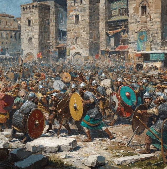 Когда наши первые отряды, прорвавшись через брешь в стене и распахнутые ворота Святого Романа, хлынули на улицы Константинополя, город, казалось, сошел с ума. Это был уже не организованный штурм, а скорее хаотичная, всепоглощающая волна, сметающая все на своем пути. Мои воины, опьяненные долгожданной победой, опьяненные кровью и яростью многомесячной осады, потерявшие многих своих товарищей под этими проклятыми стенами, растекались по узким, извилистым улочкам великого города, как вода, прорвавшая плотину. Они теснили деморализованных, панически отступающих защитников, рубили их направо и налево, врывались в дома, лавки, церкви, ища то ли добычу, то ли отмщение, то ли просто выход своей накопившейся злобе.