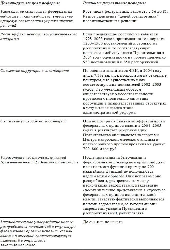 Свидетельством тому, что эффективность правительства снизилась, можно считать, например, малоуспешный старт реформы льгот, резкое снижение собираемости единого социального налога в I квартале 2005 года и беспрецедентную затяжку с принятием среднесрочной программы социально-экономического развития РФ на период 2005–2008 годов и сценарных условий социально-экономического развития страны и прогнозных показателей доходной части федерального бюджета на 2006 год и на период до 2008 года. Общие потери от снижения эффективности федеральных органов власти в 2004–2005 годах в результате реорганизации Правительства оцениваются экспертами Центра макроэкономического анализа и краткосрочного прогнозирования на уровне 700–800 млрд руб.