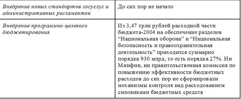 Форсированные мероприятия по реализации административной реформы вызвали ускоренную фрагментацию Правительства. Уже в апреле–мае 2004 года оно превратилось в конгломерат конкурирующих групп игроков, занятых ожесточенной борьбой за ключевые властные функции (формирование бюджета, управление Стабилизационным фондом, управление госимуществом, таможенное регулирование и пр.).