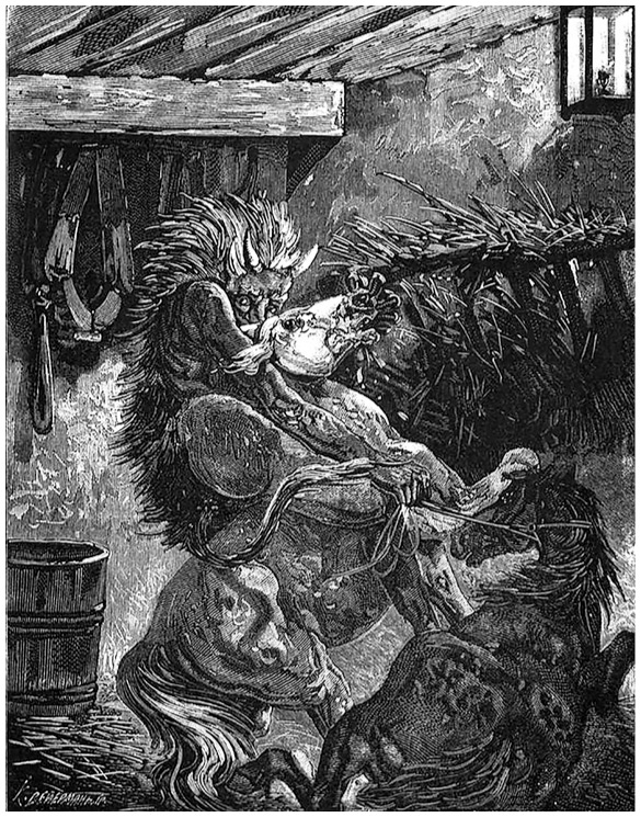 Чтобы домовой не мучил скот, также прибегают к различным мерам. Например, на шею животного навязывают богородскую траву (тимьян), ладонки [905] или колокольчик, чтобы «крестьянин мог слышать, когда домовой начинает мучить лошадь» [906] . Согласно свидетельству из Нижегородской области, если домовой не любил скот, прибегали к особому ритуалу: отламывали липовую палку, совали ее между ног старой девы, которая при этом должна была распустить волосы и «ругаться по-матерному» [907] . Охранительные меры касаются и помещения для скота: над стойлом вешают камень с дыркой («лошадиный бог») [908] , убитую сороку [909] , засовывают в щели во дворе или кладут в кормушку для скота вырванную с корнем полынь (чернобыльник) или татарник [910] , крепят над дверью чертополох, во двор запускают медведя [911] или козла [912] .
