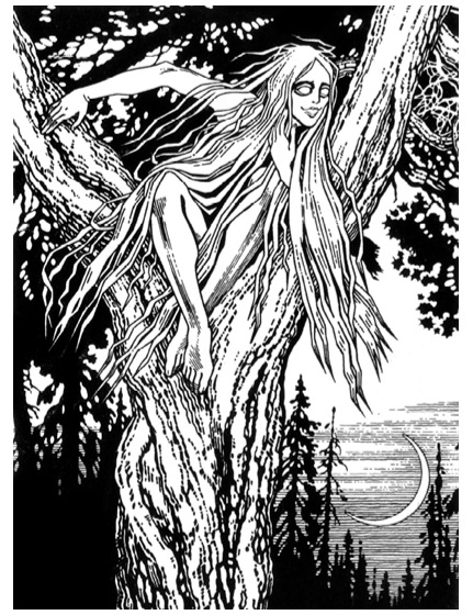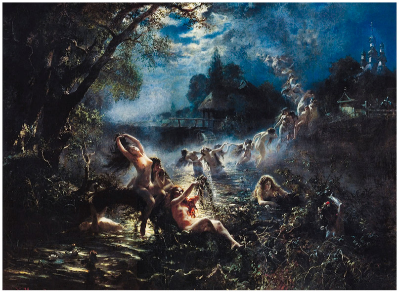Полесская русалка может описываться и без индивидуальных черт: как прекрасная девушка, как высокая худая женщина в белой или черной одежде [1224] . Южные русалки могут показаться и нагими. Севернорусскую русалку тоже описывают голой: «под березой девка [русалка — В. Р.] спит, а сама сзябла, нага, как есть» [1225] , «под горой, на песочке, у самой воды, под кустом <…> сидит женщина нагишкой» [1226] .
