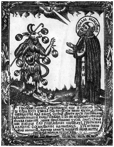 Гравюра «Преподобный Макарий и бес в тыквах». XVIII в.