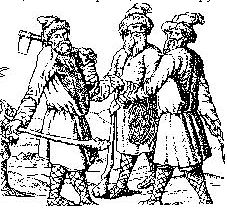 Изготовить дубинку совсем просто. Молодое деревце вырывалось из земли, комель очищался от корней, ствол обрубался по нужной длине, по усмотрению хозяина кору либо счищали, либо оставляли как есть. На иллюстрации изображены русские крестьяне в традиционных костюмах и с традиционным снаряжением. (См. рис. 4). [10] Смею усомниться в способности дубинки (ослопа) выполнять благородную функцию орудия труда. Хотя, как орудие «лихого» промысла либо как средство борьбы с многочисленными «лихоимцами»,
