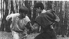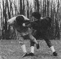 Вот мы и подошли с вами еще к одному уникальному аспекту этой борьбы. Реконструированная мною на основе принципов славяно-горицкой борьбы техника русского палочного боя наглядно показывает, что в 90 % случаев первой выходит из строя вооруженная конечность, ее попросту отбивают или ломают. Ну а теперь подумайте, надолго ли вас хватит в такой ситуации? Единственное спасение — сокращать дистанцию и лезть в борьбу, чтобы не дать атаковать себя оружием. В клинче выполнить полноценный удар палкой крайне сложно. Именно тут и пригодится навык борьбы "на вороток". Читатель, обработанный пропагандой каратэ, возможно, уже негодует, считая, что супостата нужно лихо ударить ногой с разворота — и дело с концом. Действительно, конец свой вы сильно ускорите, так как противник мгновенно отобьет вам ногу, вплоть до перелома. Траектории русского палочного боя позволяют сделать это идеально. Ну а если у врага в руке сабля, то вы вообще не оставите себе шансов.