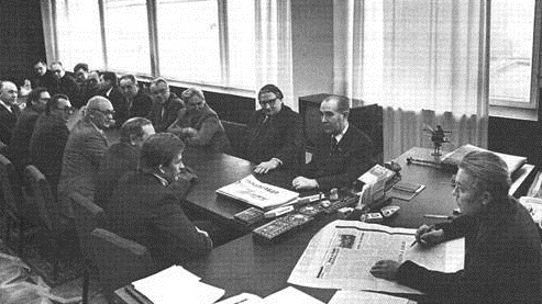 Этот вполне сорокинский диалог - из опубликованного в 1981 году очерка ответственного секретаря газеты «Правда» Анатолия Карпычева «Один день редакции»; так (по крайней мере, если верить очеркисту, - а какие у нас основания ему не верить?) общались между собой на редакционных планерках правдисты начала восьмидесятых. Очерк проиллюстрирован фотографией - за продолговатым столом сидят мрачные мужчины средним возрастом по плюс-минус шестьдесят. Роговые очки, пиджаки, галстуки, и, кажется, где-то за кадром, в предбаннике кабинета главного редактора «Правды» аккуратными рядами расставлены одинаковые, черные на красной байковой подкладке, галоши.