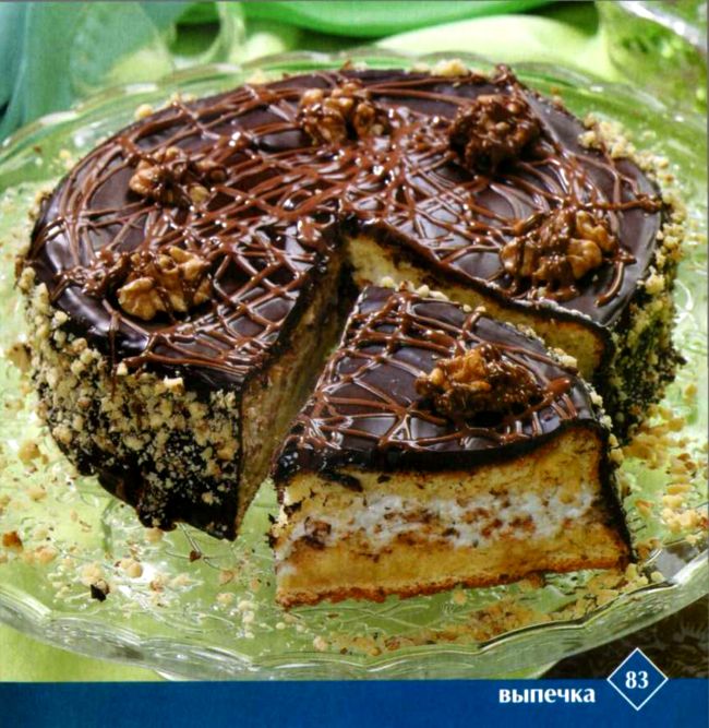 5. Бисквит разрезать вдоль на 2 коржа и прослоить их кремом. Верх и бока торта покрыть глазурью, полить растопленным на водяной бане молочным шоколадом, украсить грецкими орехами и оставить на 2–3 часа для пропитки.