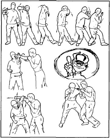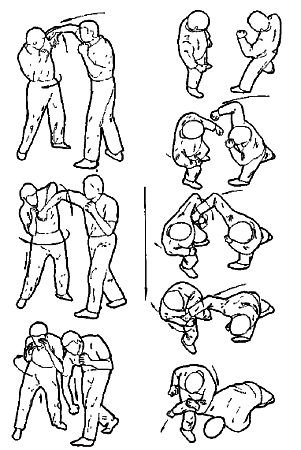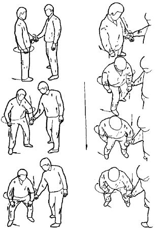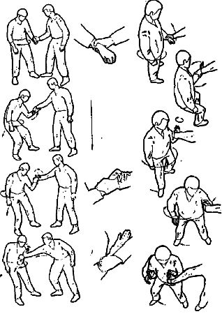 Техника выполнения более подробно будет описана в следующих номерах, но, в основном, это комбинации вышеописанных приемов защиты с приемами выбивания по кисти.