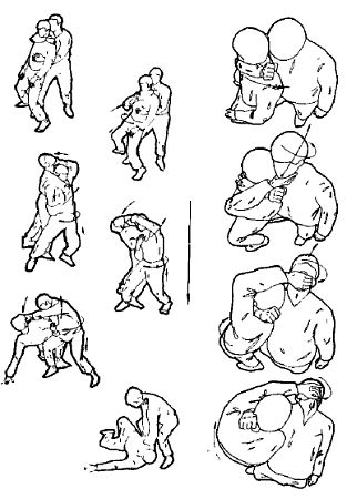 — необходимо сразу защитить шею, притянув подбородок к груди и упираясь острием подбородка в локтевой сгиб руки противника;
