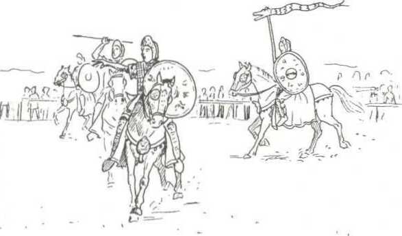 Вместе с тем спортивные состязания (гиппика гимназия1), очень напоминавшие средневековые турниры, проводились еще во времена Римской империи. В них участвовали вооруженные затупленными дротиками всадники, которые разделялись на две команды. Одна команда служила мишенью, а другая метала дротики; очки засчитыва-