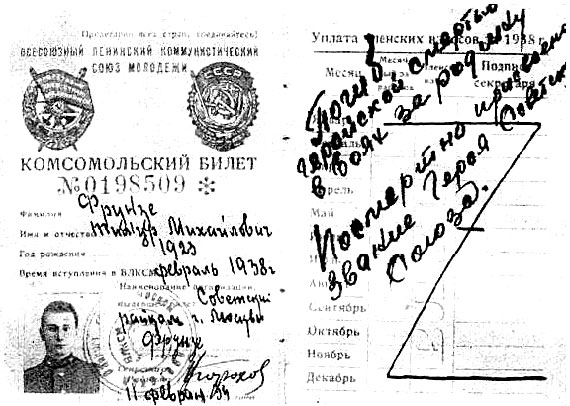 Мы войны, что прошла, не забудем,Славу павших в боях сбережем,Боевые традиции в будниСквозь учебу и жизнь пронесем.Год от года в боях закаляясь,Полк готов к новой славе идтиЗа любимых, страну и Отчизну своюПолк родной наш пройдет все пути.Комсомольский билет Тимура Фрунзе