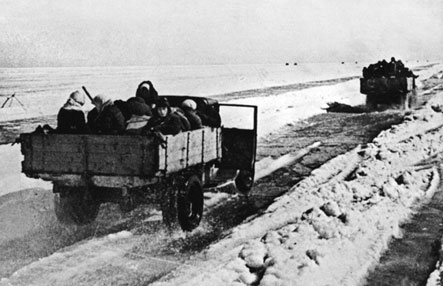 В эти дни. Коммунисты и комсомольцы г. Ленинграда возглавили соревнование за многорейсовое движение. Один из зачинателей этого движения водитель Е. Ф. Васильев совершает за двое суток восемь рейсов, преодолев свыше 1 тыс. километров, и доставил в Ленинград 12 тонн продовольствия. Примеру Васильева последовали сотни шоферов. Результаты этой самоотверженной работы не замедлили сказаться. За 12 суток, с 7 по 19 января, количество перевезенных в Ленинград грузов и обратно людей, эвакуированных из города, увеличивается вдвое (к. 26).