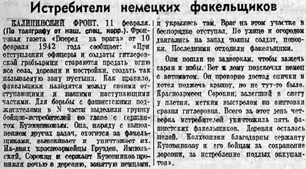 12 февраля. Четверг. В течение дня наши войска вели упорные бои с противником, продвинулись вперед и заняли несколько населённых пунктов. Немецкие войска несут тяжёлые потери в технике и, особенно, в живой силе (из оперативной сводки Совинформбюро от 12 февраля 1942 г.).
