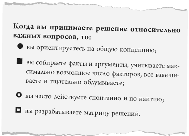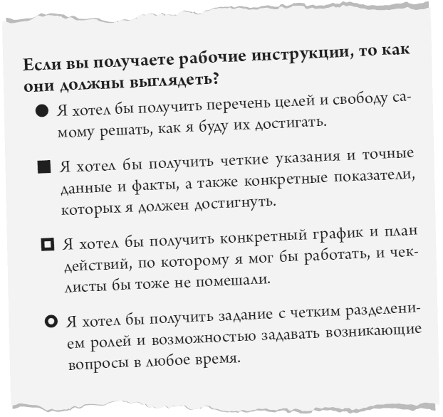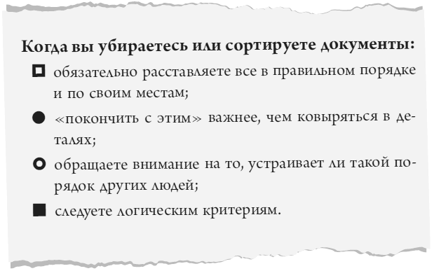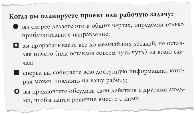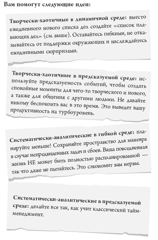 Как лучше всего организовать себя и свои задачи – это вопрос наших талантов. Людям с сильным систематическо-аналитическим мышлением (доктор наук Анна-Лиза и Оттмар) обычно легко следовать классическим советам в области тайм- и селф-менеджмента. С другой стороны, творчески-хаотичные (Игорь и Ханни) люди в гибкой и динамичной среде склонны записывать в свои списки дел, что они должны сделать, что они могли бы сделать, кому они уже давным-давно пообещали что-то сделать и что они по всему этому поводу думают. И вот, спустя всего мгновение, они брейнштормят пять вордовских страниц со стоящими перед ними задачами. Если вы попытаетесь реально приложить усилия и расположить задачи по приоритетности или решите, что вам теперь действительно нужно выполнить все задания из списка, то вы вгоните себя в состояние стресса до того, как вообще приметесь за работу.
