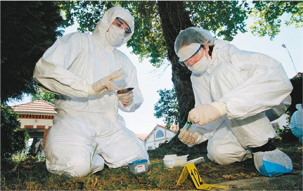 Взрывчатые вещества и их следы. Следы горения на месте взрыва могут содержать остаточные частицы конкретных взрывчатых или химических веществ. Исследование следов не до конца сгоревшего пороха на руках стрелка и вокруг огнестрельных ранений может указать на конкретный образец оружия или изобличить подозреваемого.