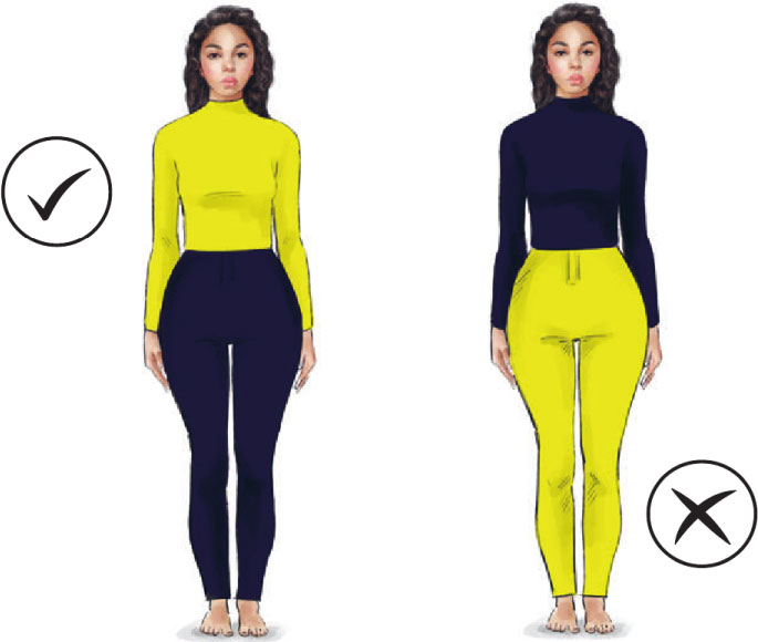 света: черты лица вырисовываются ярче, кожа выглядит гладкой и свежей. Если же он не совпадает с природной пигментацией, то проецирует на лицо множество теней. Это делает черты более резкими, кожу – тусклой и болезненной, недостатки – более заметными. Цвет может сделать старше или моложе, подчеркнуть достоинства и скрыть недостатки, сделать вас яркой – или превратить в «серую мышь». Пример на фото демонстрирует влияние цвета на одну и ту же внешность.Цвет – главный инструмент оптической иллюзии. Важно знать, какие именно характеристики цвета влияют на наше представление о размере и форме предмета. Известно, что светлые оттенки увеличивают, темные – уменьшают. Помимо светлоты, важную роль играет «температура» цвета: теплые оттенки, подобно светлым, увеличивают и привлекают внимание, холодные – скрадывают объем и являются менее заметными. Эти качества цвета используются в основных приемах камуфляжа фигуры. Для частей тела, которые хочется сделать менее заметными, используем холодные и темные оттенки; достоинства фигуры подчеркиваем теплыми и светлыми. С помощью цвета можно казаться высокой или миниатюрной, стройной или полной; можно создать иллюзию объема или, наоборот, скрыть его; можно сделать фигуру более пропорциональной – или… исказить идеальные параметры. Так вот, чтобы не произошло обратного эффекта, важно понимать, какой цвет или гамму лучше применить – и в каких частях комплекта.