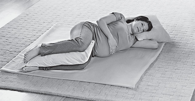 Лежа на боку. Лягте на левый бок, подложив одну или несколько подушек между колен. Эта поза усиливает приток крови к матке, облегчает боль в спине.
