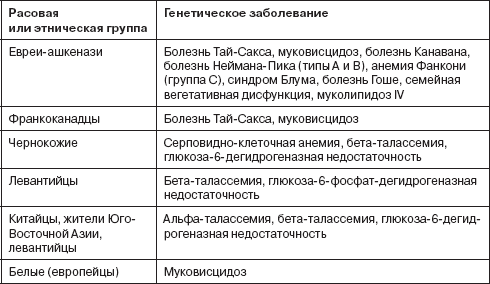 расовых и этнических группах более высок риск определенных заболеваний. Если вы принадлежите к одной из таких групп, посоветуйтесь с врачом или консультантом-генетиком, не нужен ли вам скрининг на возможное носительство (см. также материалы на цветной вклейке).Вот несколько заболеваний, вызываемых аномалией гена, которые могут распознаваться генетическим тестированием.