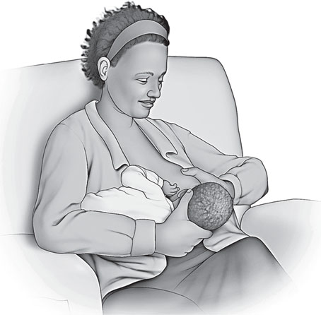 Положения для кормления. Положите ребенка себе на колени лицом к груди, так чтобы его рот был возле соска. Ребенок должен быть весь повернут к вам – живот к животу – ухо, плечо и бедро на одной линии. Свободной рукой поддерживайте грудь снизу, слегка потяните сосок вперед.