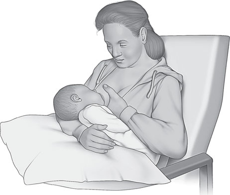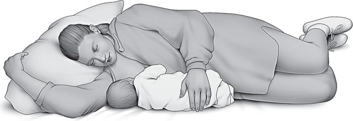 Положение на боку. Хотя большинство молодых мамочек учатся кормить сидя, иногда вы можете предпочесть сделать это лежа. Рукой, находящейся снизу, придерживайте головку ребенка у груди. Другой рукой возьмите грудь и коснитесь соском губ ребенка. Когда ребенок прочно возьмет грудь, вы можете поддер-живать его рукой, находящейся сверху, а другую подложить себе под голову.