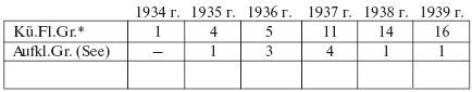 В 1935 г. был принят план создания морской авиации. Он предусматривал формирование трех смешанных авиагрупп берегового базирования (Kustenfliegergrappe — Kii.Fl.Gr.), двух авиагрупп корабельного базирования, трех смешанных групп для действий с авианосцев и трех истребительных авиагрупп берегового базирования. В общей сложности до 1 октября 1939 г. предполагалось сформировать 25 эскадрилий.