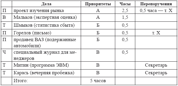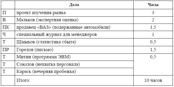 В окончательном (отредактированном) варианте план дня в нашем примере будет выглядеть как в табл. 8.Таблица 8. Итоговый план дня