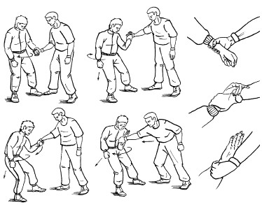 Противник может выполнять захват за запястье, руку или шею. Техника проведения приема во всех случаях будет одинакова, поэтому рассмотрим первый вариант. Итак, вы схвачены за запястье левой руки противником, превосходящим вас по силе. Возможны два варианта защиты.