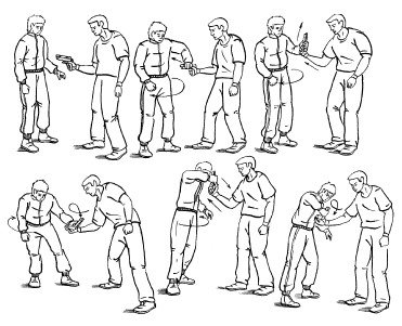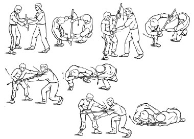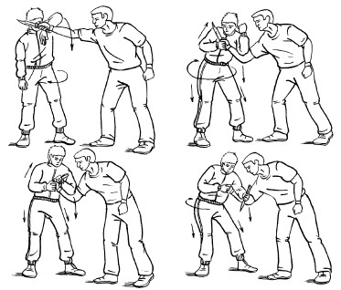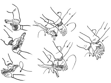 В этом разделе даются ключевые моменты техники обезоруживания противника. Самое главное – использовать рычаг, а с помощью какого оружия, не столь важно. В роли рычага с одинаковым успехом могут выступать палка, нож, бутылка, пистолет и многие другие предметы. Суть данной техники сводится к тому, что любое оружие противник держит одним и тем же хватом, а следовательно, и основа приема для выбивания оружия будет постоянной. Основные принципы: