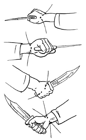 – принцип выбивания ножа ничем не отличается от принципа освобождения конечности из захвата. Помните: схваченный за лезвие нож является продолжением вашей руки;