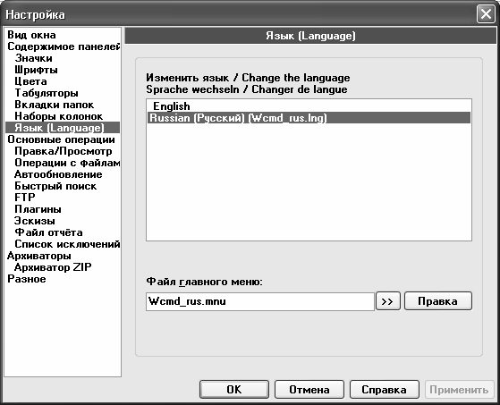 В поле Изменить язык содержится список языков, поддерживаемых данной версией программы. Чтобы выбрать язык, выделите его в списке курсором и нажмите кнопку Применить либо ОК . Но помните, его смена языка относится только к рабочим окнам Total Commander. Например, язык справки вы здесь не поменяете – он останется таким, какой заложен изначально.