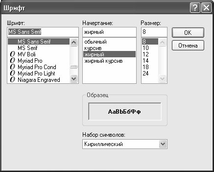 Вначале в поле Шрифт нужно указать подходящий тип шрифта, затем в поле Начертание – вариант его начертания, после чего в поле Размер – требуемый размер символов. Значения всех трех параметров выбираются щелчком мыши на соответствующей позиции. При этом в поле Образец демонстрируется пример того, как будет выглядеть выбранный шрифт при текущих настройках. Завершается процесс настройки параметров шрифта нажатием кнопки ОК . С помощью кнопки Отмена осуществляется выход из данного режима без сохранения изменений.