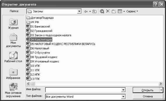 Для открытия сохраненного ранее текстового документа предназначена команда Файл -> Открыть , вызываемая также нажатием комбинации клавиш Ctrl+O . При активизации данной команды появляется окно Открытие документа (рис. 5.6).