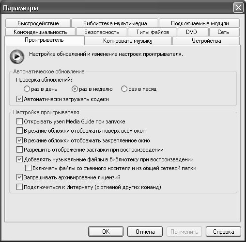 Как видно на данном рисунке, окно настройки включает в себя несколько вкладок: Проигрыватель , Копировать музыку , Устройства , Быстродействие , Библиотека мультимедиа , Типы файлов , Сеть , и др. На них в зависимости от назначения и функциональности сгруппированы однотипные параметры. В этой книге мы рассмотрим наиболее востребованные из них.