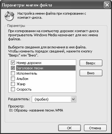 В частности, путем установки соответствующих флажков вы можете указать сведения, включаемые в имя файла ( Номер дорожки , Исполнитель и др.), а также в раскрывающемся списке выбрать тип разделителя между ними. С помощью кнопок Вверх и Вниз определяется порядок расположения элементов имени файла. Например, можно задать следующие форматы имени музыкального файла: 01-Песня-Исполнитель. WMA , или Исполнитель_Альбом_Песня_01.WMA , и т. д. (в данном случае 01 – это номер дорожки).