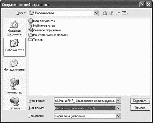 Если страница понравилась и вы хотите ее сохранить на диске, то выполните команду Файл, Сохранить. При сохранении (рис. 207) выберите тип файла Веб-архив — вся веб-страница (текст и картинки) будет сохранена в одном файле с расширением. mht. Это очень удобно, особенно если вы потом захотите переслать эту страницу своему другу по почте — нужно будет передать всего один файл.