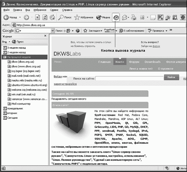 Журнал позволяет немного освежить вашу память, а именно просмотреть адреса страниц, которые вы недавно посещали (рис. 209). Для открытия журнала нажмите кнопку Журнал на панели инструментов.