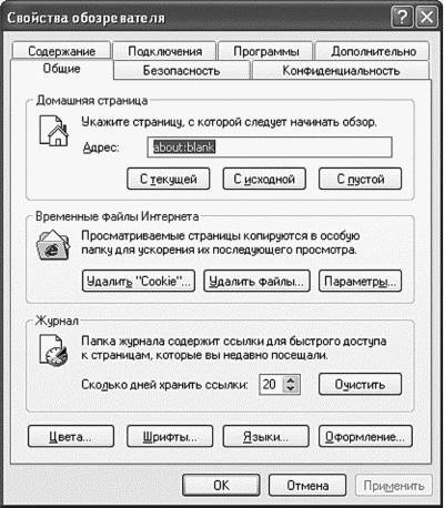 Вам настолько понравилась страница, что вы хотите посещать ее каждый день? Установите ее в качестве домашней страницы. Для этого выполните команду Сервис, Свойства обозревателя и в появившемся окне (вкладка Общие, поле Адрес) введите адрес страницы. Можно просто нажать кнопку С текущей, если в данный момент ваша любимая страница загружена в браузере (рис. 210).