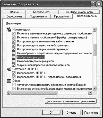 Для отключения картинок выполните команду Сервис, Свойства обозревателя, затем перейдите на вкладку Дополнительно, в группе Мультимедиа выключите параметр Отображать рисунки (рис. 211).