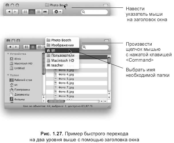 Щелчок мыши по заголовку окна документа любого приложения с нажатой клавишей <Command> вызывает дерево папок, первая папка которого содержит данный документ (рис. 1.28). Выбор имени папки из перечня переключает нас в Finder и открывает соответствующую папку.