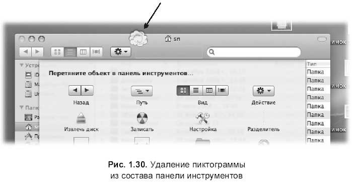 Удаление пиктограммы из состава панели инструментов возможно и при закрытом окне настроек. Для этого следует перетащить значок за пределы окна, удерживая клавишу <Command>.