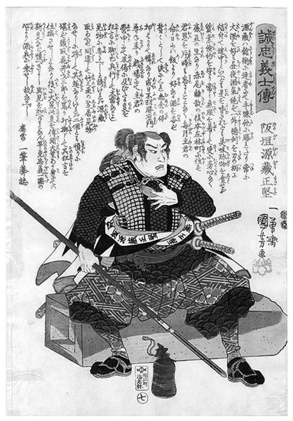 Сакагаки Гэндзо Масаката, восседающий с копьем в руке на сломанном постаменте. Утагава Куниёси. XIX в.
