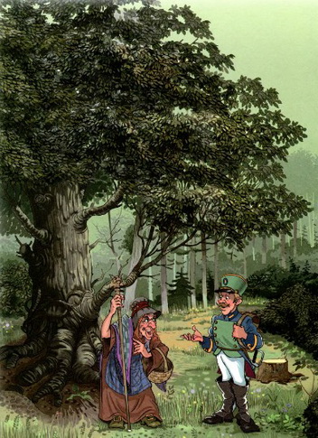 — Видишь вон то старое дерево? — сказала ведьма, показывая на дерево, которое стояло неподалеку. — Оно внутри пустое. Влезь наверх, там будет дупло, ты и спустись в него, в самый низ! А перед тем я обвяжу тебя веревкой вокруг пояса, ты мне крикни, и я тебя вытащу.