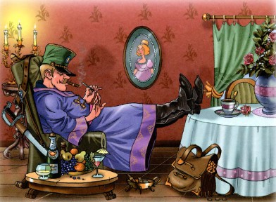 Слуга, который чистил приезжим обувь, удивился, что у такого богатого господина такие плохие сапоги, но солдат еще не успел обзавестись новыми. Зато на другой день он купил себе и хорошие сапоги и богатое платье. Теперь солдат стал настоящим барином, и ему рассказали обо всех чудесах, какие были тут, в городе, и о короле, и о его прелестной дочери, принцессе.