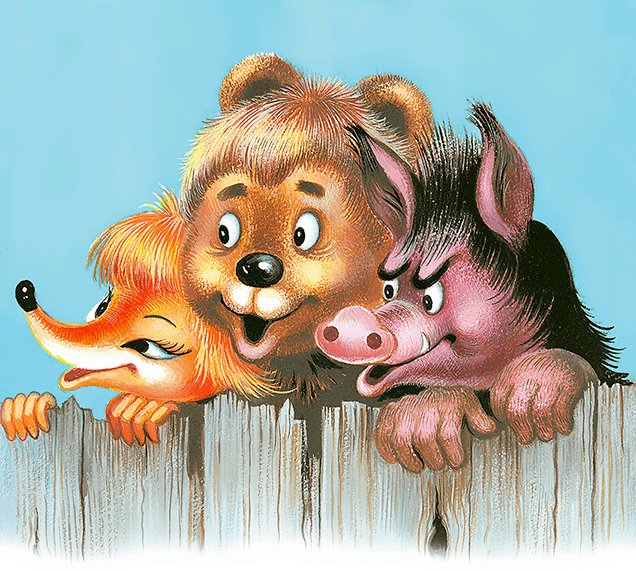 Принёс Волк бадью домой, а тут Кабан, Лиса и Медведь появились.