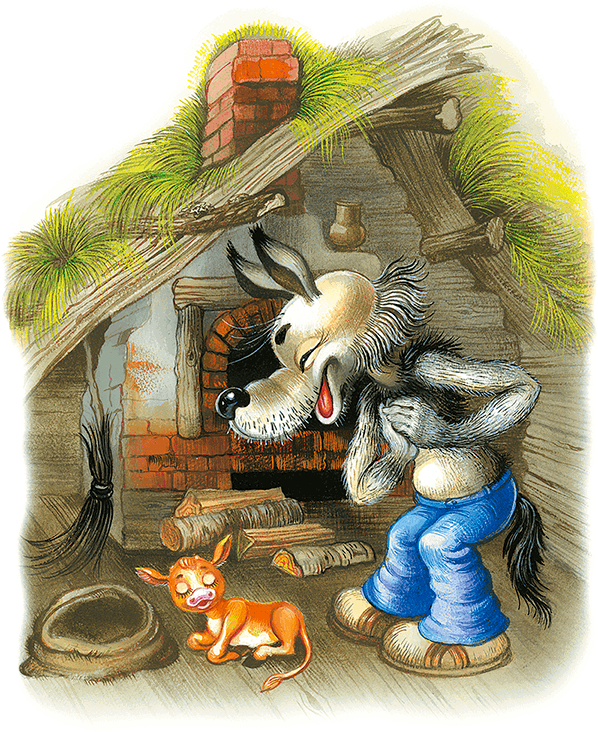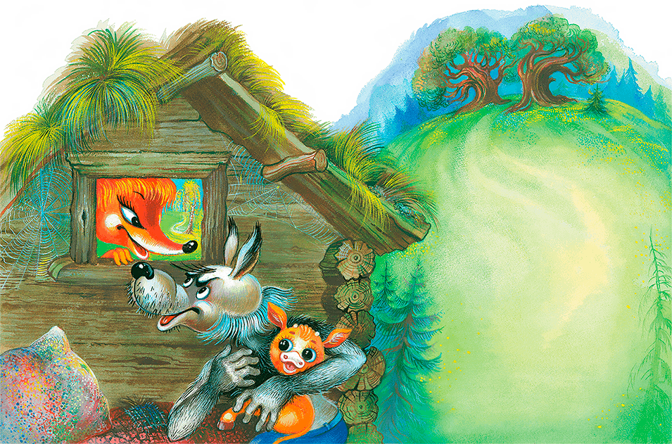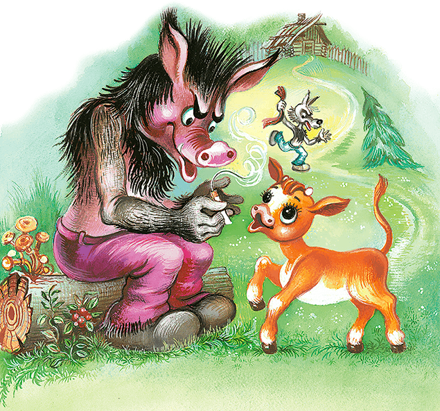 Однажды Волк украл в деревне Телёнка. Засунул в мешок и принёс к себе в избу. А